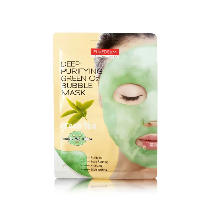 Purederm Green Tea Deep Purifying Green O2 Bubble Mask effectively removes impurities, dead skin cells, and sebum, brightening your skin tone and deeply cleansing your skin. Green Tea Extract purifies the skin from environmental pollutants, while the Superfood 10 Complex revitalizes tired skin, restoring energy and vitality. This wash-off deep cleansing mask also contains Papaya Fruit and Sugarcane Extracts to remove excess sebum and dead skin, leaving your complexion fresh and rejuvenated.