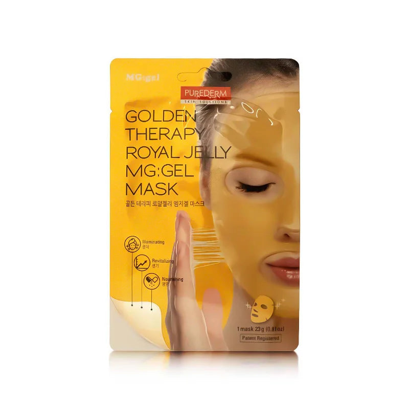 Purederm Golden Therapy Royal Jelly MG Gel Mask, enriched with royal jelly—a high-protein substance for queen bees—and luxurious gold, delivers abundant nutrition and elasticity to the skin. Collagen and panthenol work together to firm the skin, leaving it with a honey-glow texture. This premium therapy mask offers a deeply nourishing experience, promoting radiant and revitalized skin.