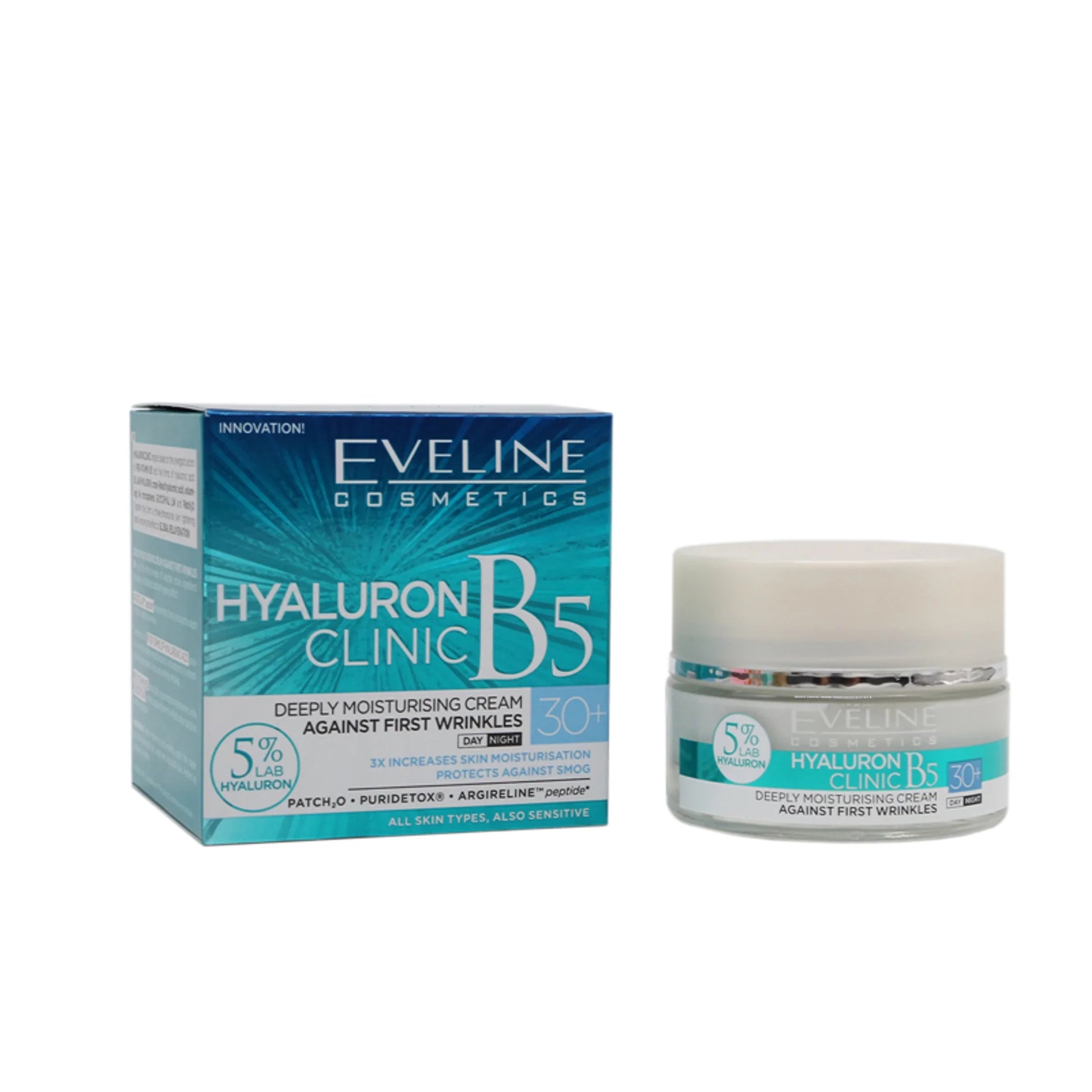 Eveline Cosmetics HYALURON CLINIC range is based on the synergistic action of PRO-VITAMIN B5 and five forms of hyaluronic acid: 5% Lab hyaluron, Cross-linked hyaluronic acid, Volumizing HA microspheres, Glycohyal LW, and PatcH2). Together they form a three-dimensional skin tightening matrix, ensuring the effect of global rejuvenation. Eveline Cosmetics Hyaluron Clinic B5 Day & Night Cream 30+ is a deeply moisturizing cream against first wrinkles 30+, uses the effectiveness of selected active ingredients to ensure a multi-directional anti-aging effect. ARGIRELINETM PEPTIDE: Relaxes and mimics lines, reduces depth and length of wrinkles. FIVE FORMS OF HYALURONIC ACID: Provides skin with intense moisturization and restores its smoothness. Reduces and mimics lines and existing wrinkles. PRO-VITAMIN B5: Stimulates regeneration mechanism.