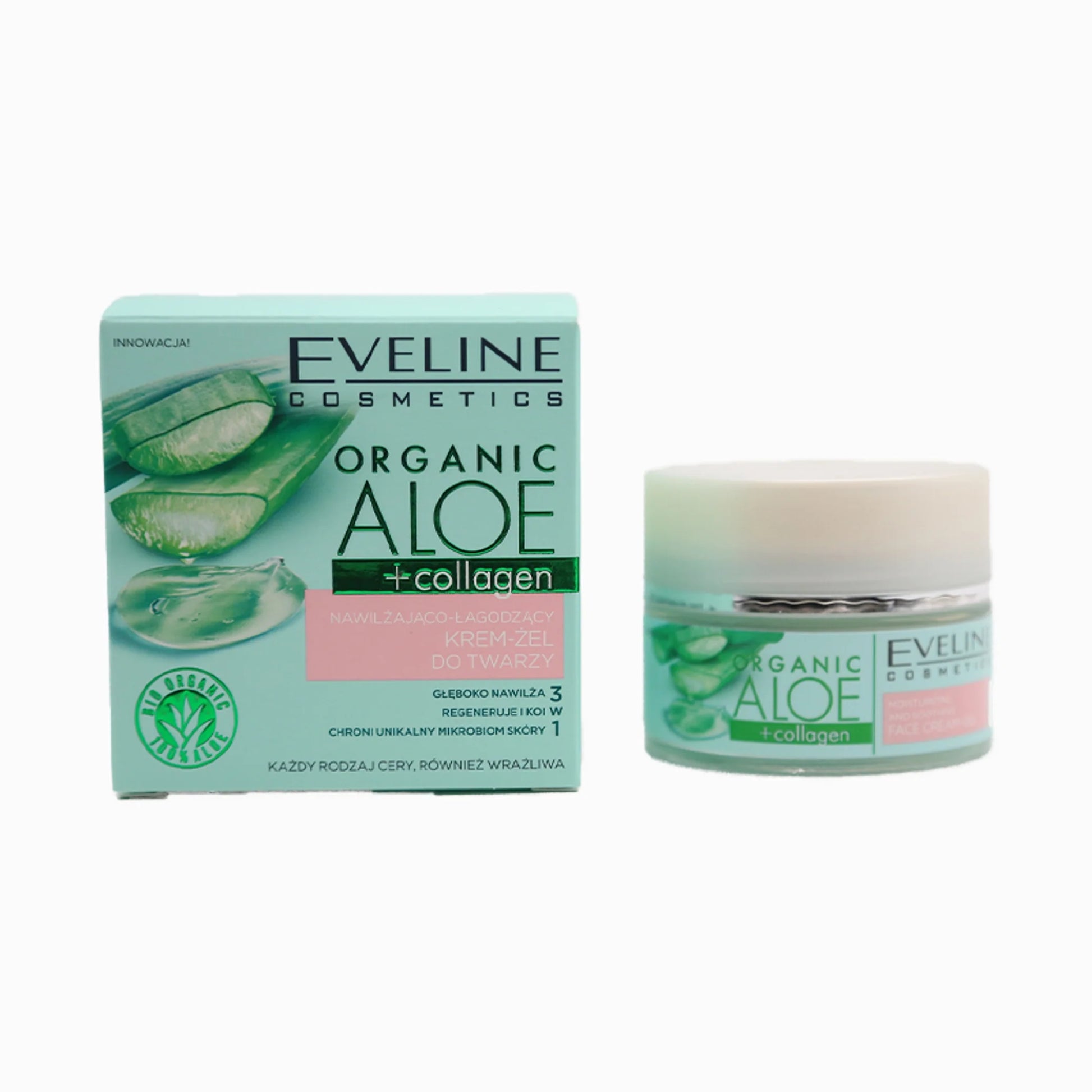 Eveline Cosmetics Organic Aloe + Collagen Line is based on synergic action of 100% organic aloe and plant collagen. Thanks to the ultra light formulas, it effectively and long-lastingly moisturizes the skin as well as activates its regeneration processes, thus restoring healthy look and vital glow to complexion. Moisturizing and soothing face cream-gel intensely soothes and nourishes the skin, providing it with the comfort and feeling of freshness all day long. Unique formula enriched with Aloe Hydra Deep System guarantees long-lasting and deep hydration. The cream eliminates symptoms of irritation, reduces dryness and restores silky softness to the skin, reinforces the immune system of the epidermis and evens out skin tone. Idea for daily care of all skin types. Absorbs quickly and does not leave a greasy film, ensuring comfortable application. - 100% Organic Aloe: Provides the immediate effect of hydration and long-lasting feeling of comfort. Intensely regenerates the skin and effectively soothes the symptoms of irritation. - Plant Collagen: Strongly anti-aging that intensely firms the skin and protects it against harmful external factors.