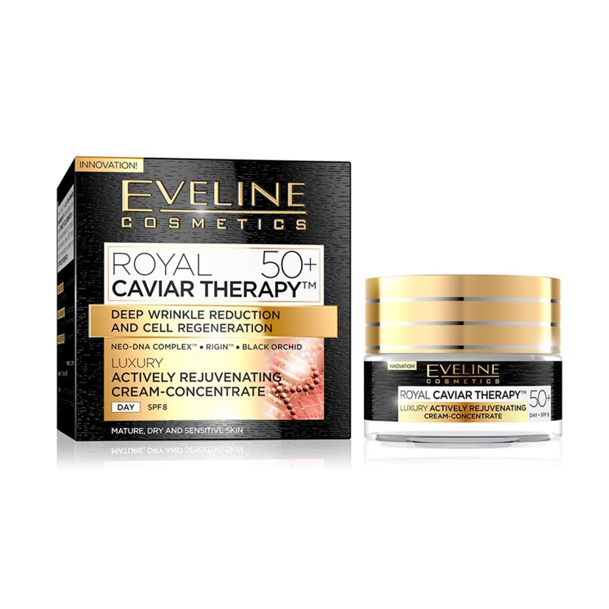 Eveline Cosmetics Royal Caviar Therapy Day Cream 50+ is an innovative formula of the Luxury Actively Rejuvenating Day Cream Concentrate 50+ was developed based on breakthrough TECHNOLOGY OF CELLS REGENERATION, inspired by the research on the repair mechanism of damage to skin cells DNA (Nobel Prize in chemistry in 2015). The day cream, thanks to optimally selected active ingredients ensures a 3 Step Process of Regeneration: Step 1 NEO-DNA COMPLEX™ Stimulates the process of new cell formation, repairing damage to DNA. Step 2 ROYAL CAVIAR™ and RIGIN™ Renew the structure of supporting proteins, improve skin density and fill even deep wrinkles. Step 3 BLACK ORCHID EXTRACT Deeply nourishes skin and has anti-free radical action.