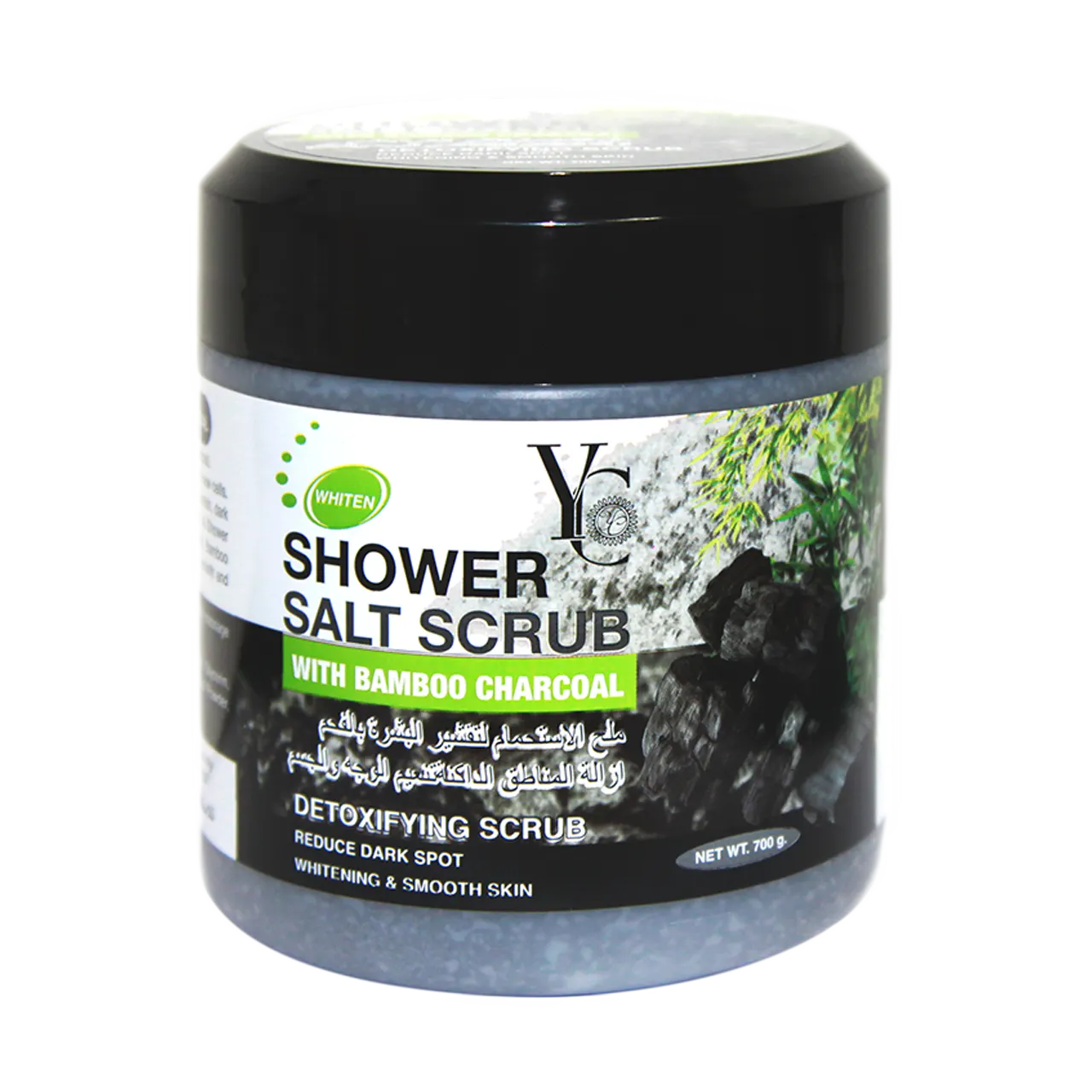 Yong Chin Shower Salt Scrub with Bamboo Charcoal helps detoxify skin, remove old skin cells and replenish with new cells. This special formulation also adjusts the skin tone to be even, reduces blemish and dark spots and renews skin regenerating process for natural whitening effect. It offers a delicate texture that is a combination of natural salt, bamboo charcoal and multi-vitamins that makes the skin glow and offers a healthy, smooth and moisturized finish.