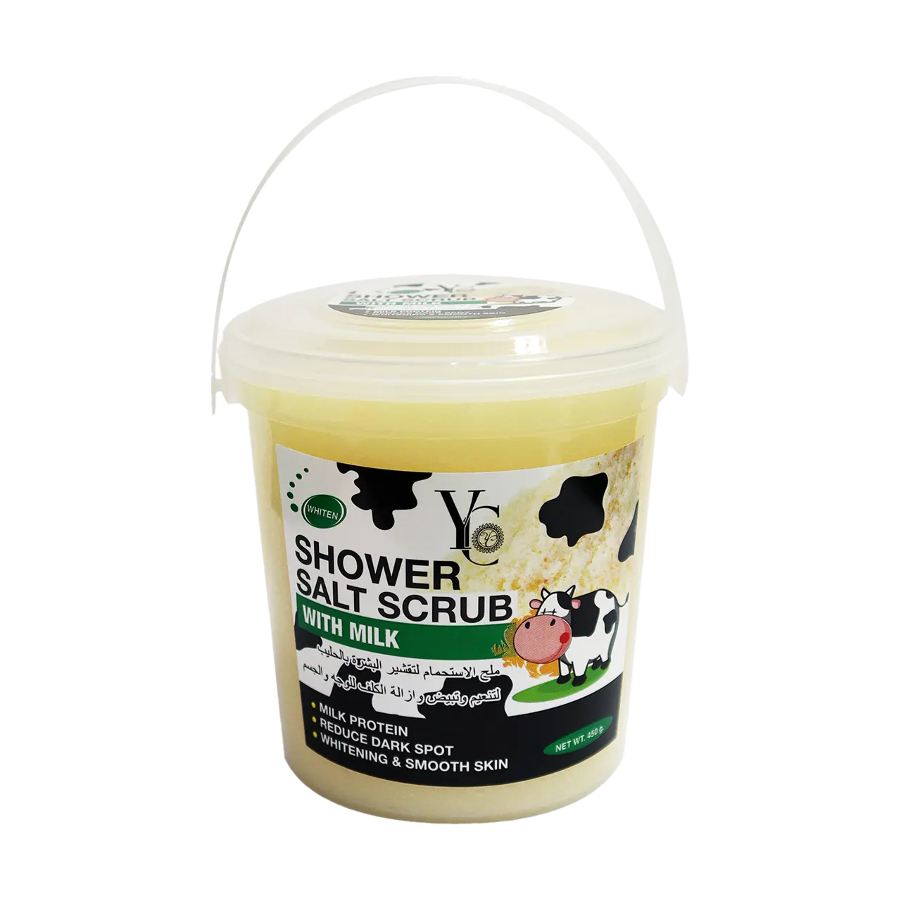 YC Shower Salt Scrub with Milk Extract is a unique product that aids in the removal of old skin cells and promotes the rejuvenation of new cells. Its special formulation helps even out skin tone, reduce blemishes and dark spots, while naturally enhancing the skin's whitening process. With a delicate texture and a combination of natural salt, milk protein, and vitmain complex, this shower salt scrub leaves your skin glowing, healthy, smooth, and moisturized.