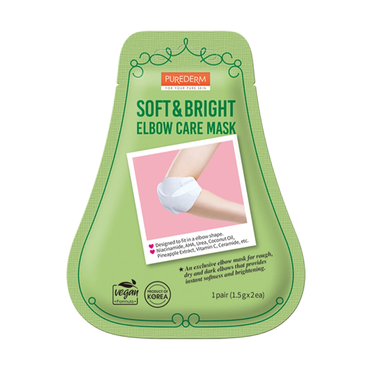 Purederm Soft & Bright Elbow Care Mask is designed to restore rough, dry, and dark elbows to smooth, bright skin. The waterproof fabric is enriched with a nourishing essence that moisturizes and delivers active ingredients to the skin. Fruit Acid Complex and AHA smooth rough skin, while Coconut Oil, Ceramide, Niacinamide, and Vitamin C brighten dark elbows and provide deep hydration. This vegan formula is a product of Korea.