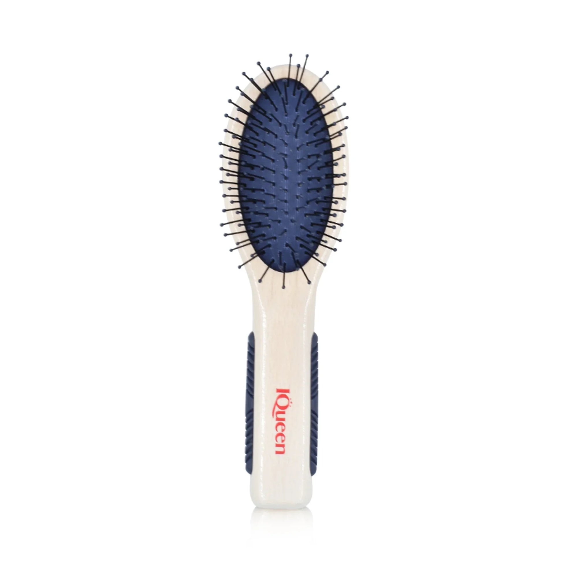 IQueen Styling Tek Detangler Hair Brush Series The sheer whitewashed finish subtly reveals the natural wood grain, while contrasting indigo rubber inserts provide a secure, stylish grip. Flexible nylon bristles with ball tips offer a gentle, pain-free detangling experience for both wet and dry hair. The dense bristle arrangement enhances detangling efficiency and control. Heat-resistant ionic nylon reduces frizz, locks in moisture, and leaves hair with a healthy, shiny finish. Oval Shape, Medium Size, Overall Width: 65mm, Length: 220mm