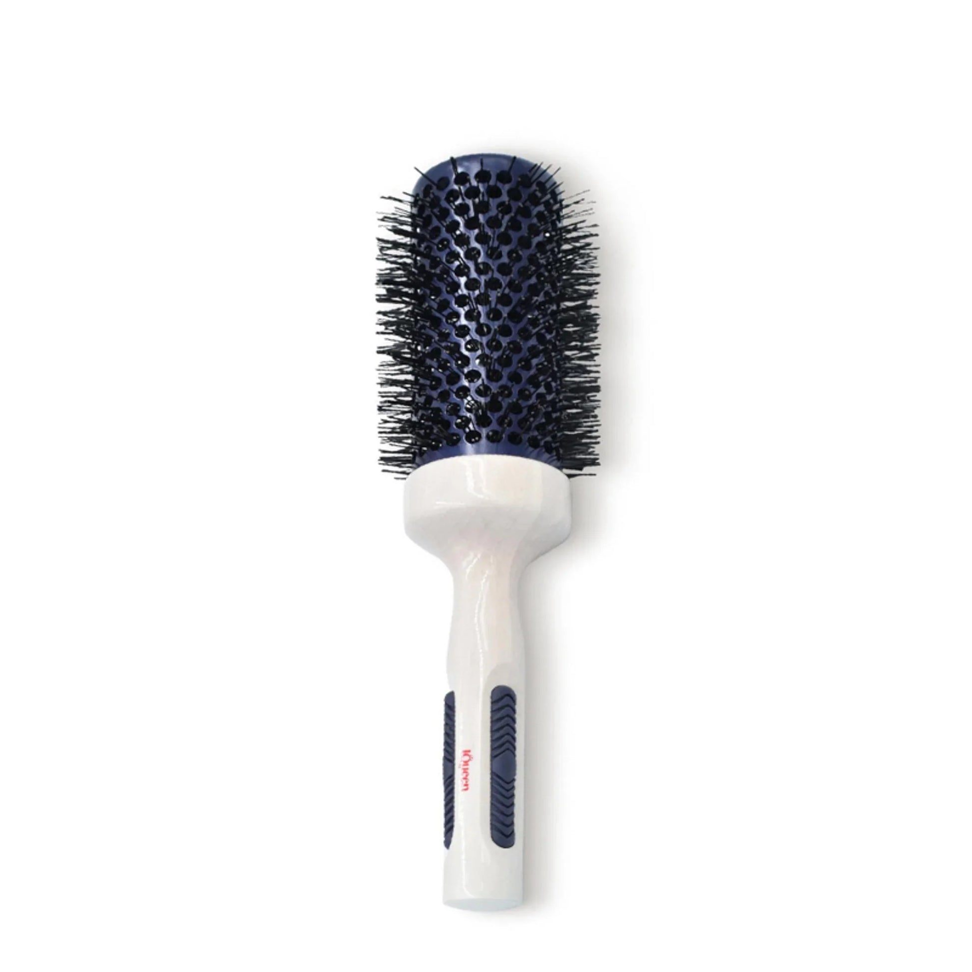 IQueen Styling Tek Vent Thermal Hair Brush Series A sheer whitewashed finish subtly reveals the natural wood grain, while indigo rubber inserts offer a striking contrast and superior grip. The Alternative Bristling design combines double-strand nylon for deep, snag-free penetration and open-tip ionic bristles for optimal hair control and conditioning. Together, they deliver effortless curling, straightening, volumizing, and sectioning—outperforming traditional round brushes with ease. Overall Diameter: 72mm, Length:266mm